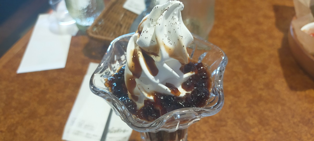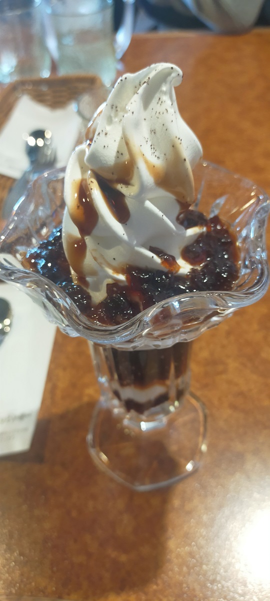 先ほどの「コーヒー牛乳味のソフトクリーム」に、すっきりした味わいのコーヒーゼリーが追加されると、先ほど食べたハンバーグでモタッとした口の中がリセットされる気がします。
